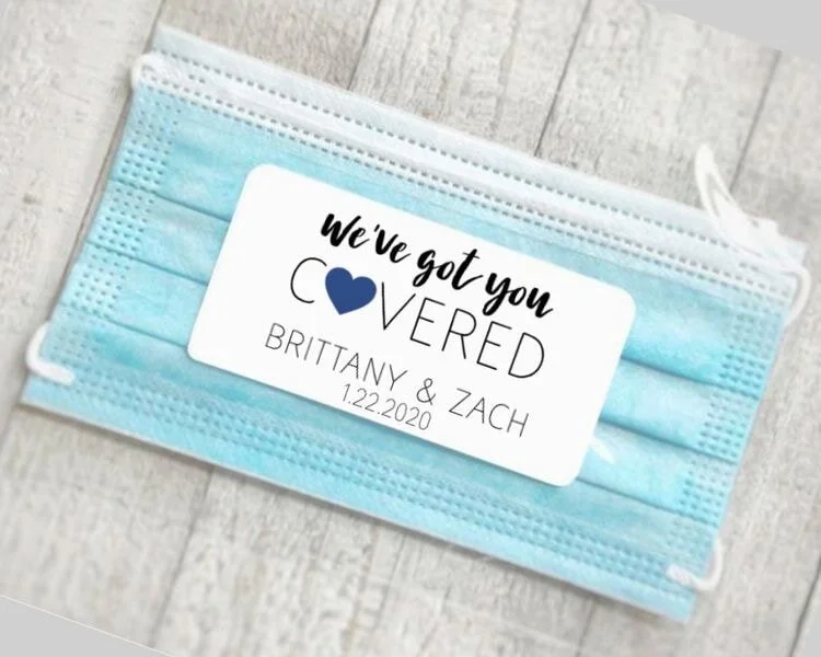 Along with this, you can have custom stickers made to place over each plastic bag containing a disposable mask. It’s not only cute, but a fun way to encourage your guests to be safe as well!